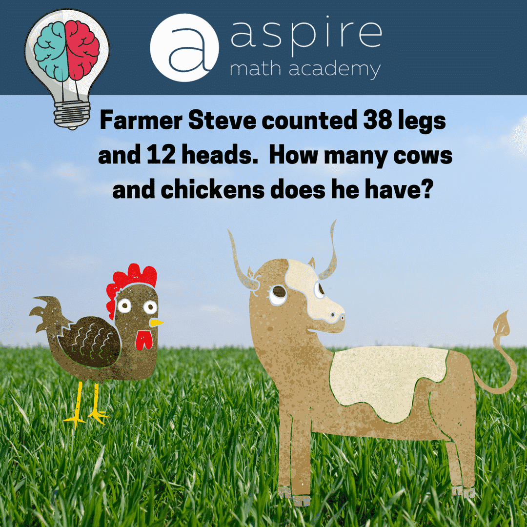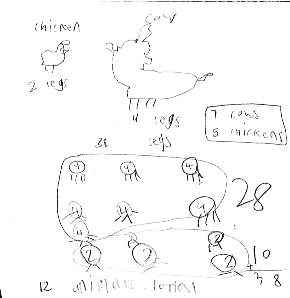 Explanation: Instruct the student to begin thinking about what they know. A child should know that cows have 4 legs and a chicken has 2. They should also recognize that each animal will only have one head (Meaning there are only 12 animals total). Have the student begin by constructing a diagram that clearly shows what they know. They should draw a model of a chicken clearly labeling the two legs and a model of a cow clearly labeling the 4 legs. Next, instruct the student to draw 12 circles to represent the 12 total possible animals. Using the guess and check method, have the student begin to draw 4 legs on a few of the 12 heads. After, instruct the student count and speculate how many more legs are needed and which type of animal it maybe be. Using an educated guess as well as trial and error the student will be able to complete their diagram with 7 cows and 5 chickens totaling to 38 legs.